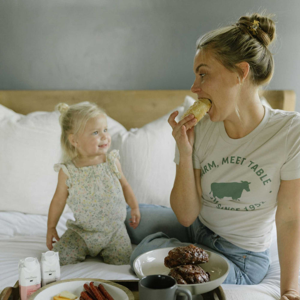 We are proud of our deep-rooted dairy legacy and passionate about bringing fresh and wholesome dairy to your table every day. The Creamery designed “Farm, Meet Table” adult t-shirt is supremely soft and highlights the value of real, fresh dairy.